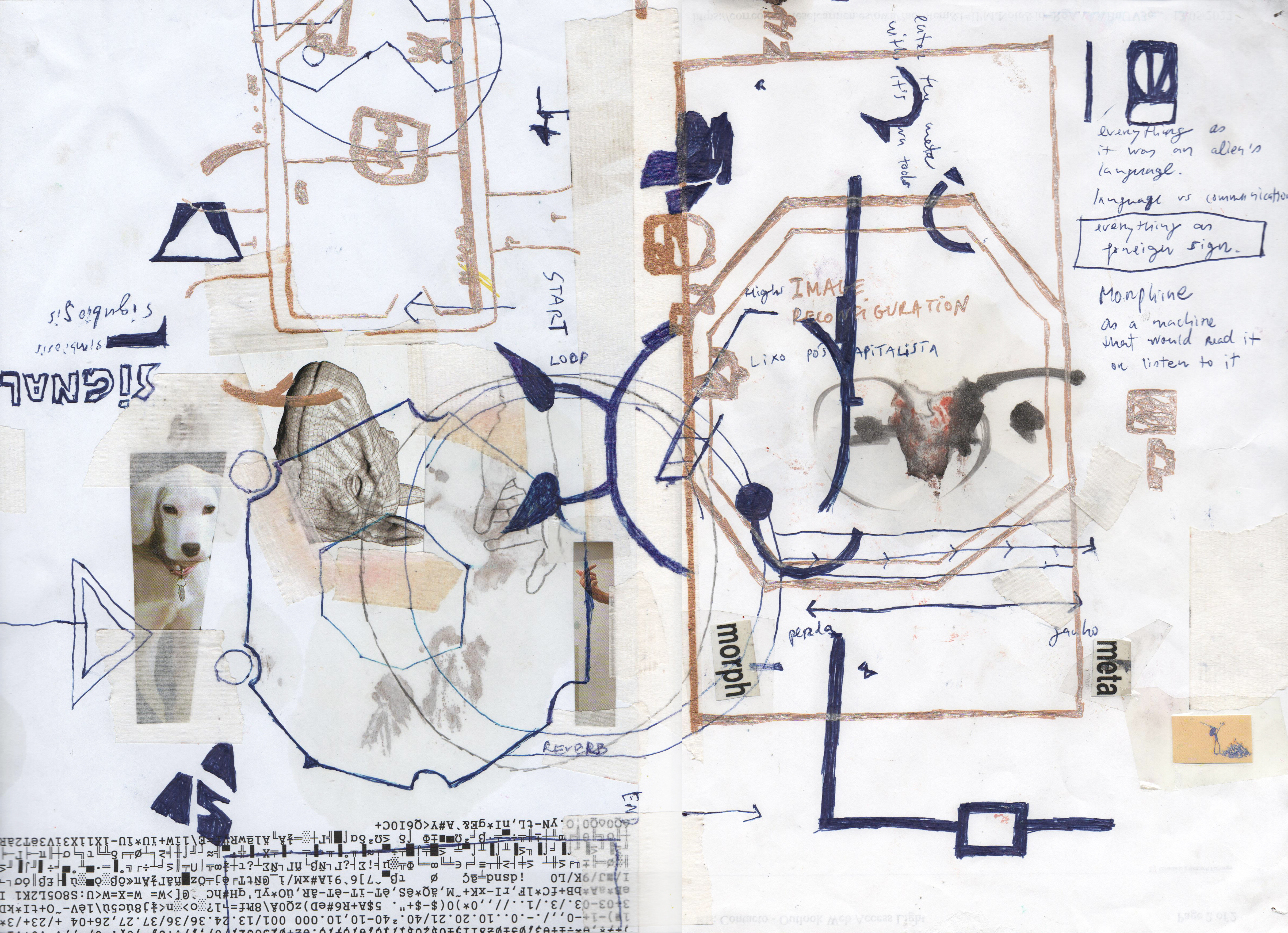 In these works I explore new ways of generating thought and creation, through the combination of images, and the ideas and thoughts they evoke, which are then put on paper, either in words, collage or drawing. Their surfaces are also ways of archiving other images, marks, words, cutouts, schemes and maps. They come close to the idea of an atlas, a psychogeographic map. Poetry exercises, or spontaneous writing, with references to literature. They rehearse possibilities of how all of this can be used to create new fictions (artistic creation is always to create fictions, which may or may not become our reality). These are ways of studying and speculating. Speculate about language, about communication, about the future, about life, about the possibilities of image and text, and also of text as an image.