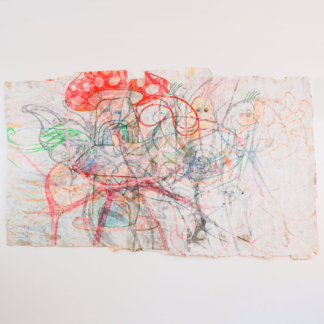 Mushrooms, 2022. Colored pencils, acrylic, oil, collage, markers, graphite and wallpaint on paper. 160 x 250 cm.